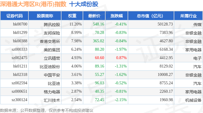深港通大湾区R(港币)(483090)指数十大成份股详情如下:
