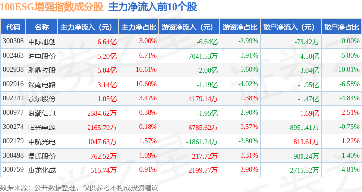 资金流向方面,100ESG增强(970033)指数成份股当日主力资金净流出合计19.67亿元,游资资金净流出合计3.16亿元,散户资金净流入合计22.82亿元。成份股资金流向详情见下表: