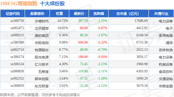 100ESG增强(970033)指数十大成份股详情如下: