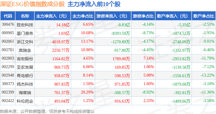 资金流向方面,深证ESG价值(970061)指数成份股当日主力资金净流入合计6.46亿元,游资资金净流出合计7.38亿元,散户资金净流入合计9194.62万元。成份股资金流向详情见下表: