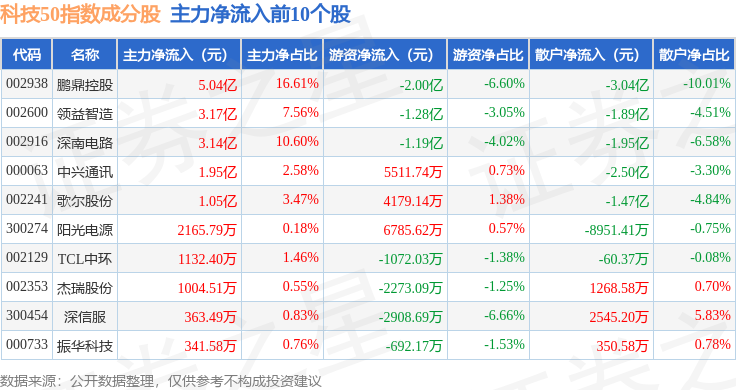 资金流向方面,科技50(970080)指数成份股当日主力资金净流出合计33.73亿元,游资资金净流入合计6.8亿元,散户资金净流入合计26.93亿元。成份股资金流向详情见下表: