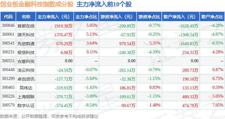 资金流向方面,创业板金融科技(970085)指数成份股当日主力资金净流出合计25.23亿元,游资资金净流入合计2.99亿元,散户资金净流入合计22.23亿元。成份股资金流向详情见下表: