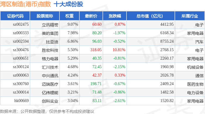 湾区制造(港币)(980010)指数十大成份股详情如下: