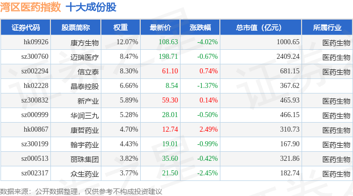 证券之星消息,12月9日,湾区医药(980013)指数报收于1933.03点,跌1.36%,成交71.9亿元,换手率1.05%。当日该指数成份股中,上涨的有4家,康哲药业以2.49%的涨幅领涨,下跌的有26家,先健科技以8.38%的跌幅领跌。