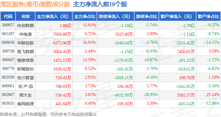 资金流向方面,湾区服务(港币)(980012)指数成份股当日主力资金净流出合计12.23亿元,游资资金净流出合计3712.36万元,散户资金净流入合计12.6亿元。成份股资金流向详情见下表: