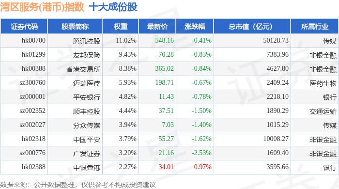 湾区服务(港币)(980012)指数十大成份股详情如下: