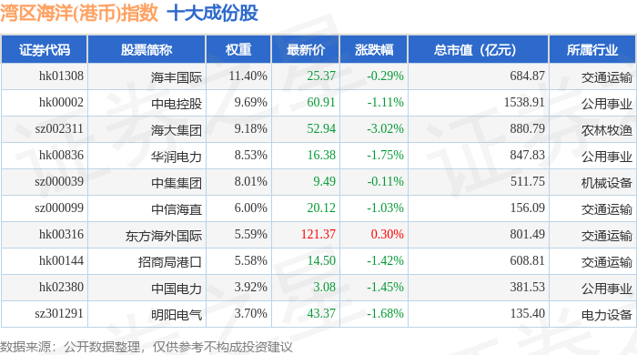 湾区海洋(港币)(980020)指数十大成份股详情如下: