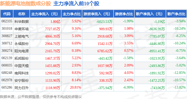 资金流向方面,新能源电池(980027)指数成份股当日主力资金净流出合计11.0亿元,游资资金净流入合计3.56亿元,散户资金净流入合计7.44亿元。成份股资金流向详情见下表: