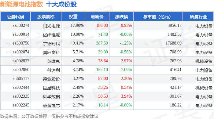 证券之星消息,12月9日,新能源电池(980027)指数报收于3382.22点,跌0.32%,成交462.98亿元,换手率1.84%。当日该指数成份股中,上涨的有16家,星云股份以5.4%的涨幅领涨,下跌的有34家,中国天楹以7.75%的跌幅领跌。