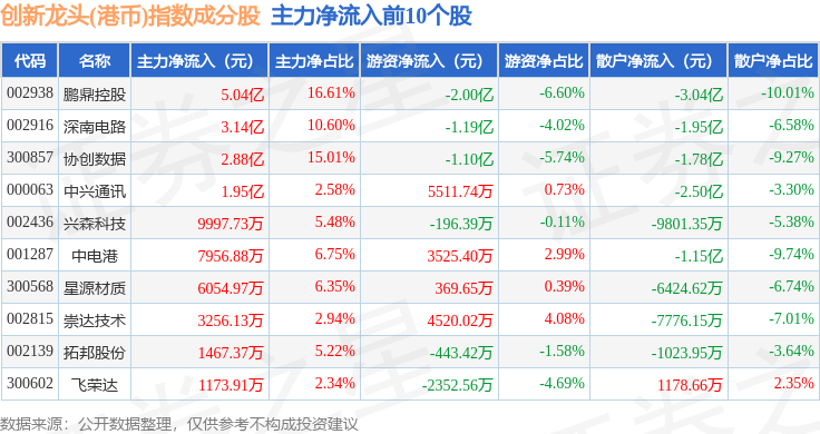 资金流向方面,创新龙头(港币)(980037)指数成份股当日主力资金净流出合计23.39亿元,游资资金净流入合计6.61亿元,散户资金净流入合计16.78亿元。成份股资金流向详情见下表: