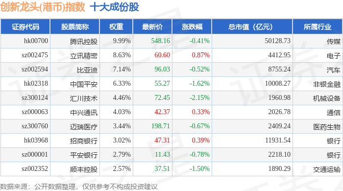 创新龙头(港币)(980037)指数十大成份股详情如下: