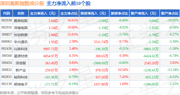 资金流向方面,深圳高新(980038)指数成份股当日主力资金净流出合计7.61亿元,游资资金净流入合计2.68亿元,散户资金净流入合计4.93亿元。成份股资金流向详情见下表: