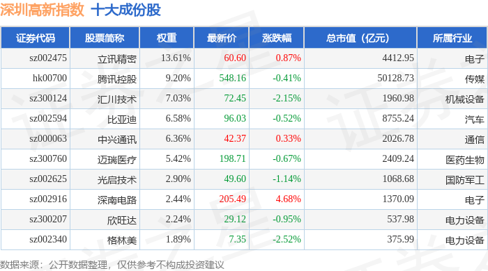 证券之星消息,12月9日,深圳高新(980038)指数报收于4937.48点,跌0.29%,成交743.88亿元,换手率1.76%。当日该指数成份股中,上涨的有15家,鹏鼎控股以6.05%的涨幅领涨,下跌的有35家,科达利以7.09%的跌幅领跌。