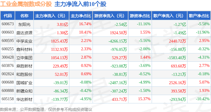 资金流向方面,工业金属(980043)指数成份股当日主力资金净流出合计50.54亿元,游资资金净流入合计15.71亿元,散户资金净流入合计34.82亿元。成份股资金流向详情见下表: