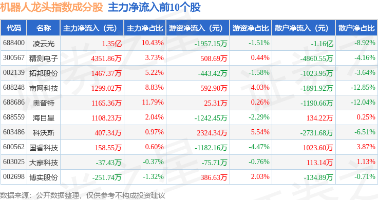 资金流向方面,机器人龙头(980071)指数成份股当日主力资金净流出合计20.71亿元,游资资金净流入合计4.67亿元,散户资金净流入合计16.04亿元。成份股资金流向详情见下表: