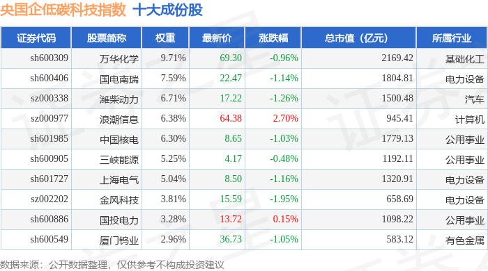 央国企低碳科技(980082)指数十大成份股详情如下: