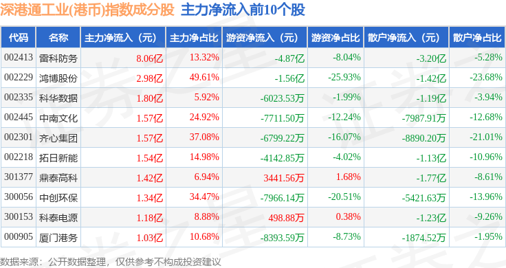 资金流向方面,深港通工业(港币)(983018)指数成份股当日主力资金净流出合计63.0亿元,游资资金净流入合计2.04亿元,散户资金净流入合计60.96亿元。成份股资金流向详情见下表: