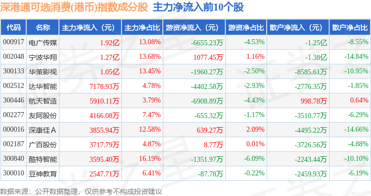 资金流向方面,深港通可选消费(港币)(983020)指数成份股当日主力资金净流出合计57.73亿元,游资资金净流入合计7.45亿元,散户资金净流入合计50.27亿元。成份股资金流向详情见下表: