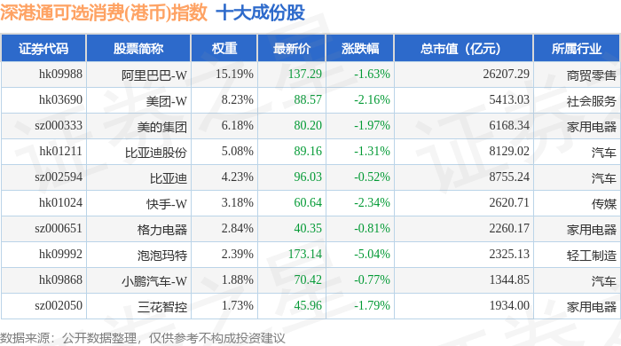 深港通可选消费(港币)(983020)指数十大成份股详情如下: