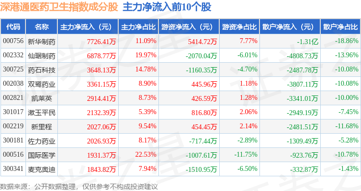 资金流向方面,深港通医药卫生(983023)指数成份股当日主力资金净流出合计17.74亿元,游资资金净流入合计4.37亿元,散户资金净流入合计13.37亿元。成份股资金流向详情见下表: