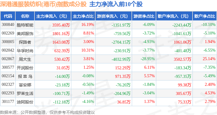 资金流向方面,深港通服装纺织(港币)(983042)指数成份股当日主力资金净流出合计4645.92万元,游资资金净流出合计7389.76万元,散户资金净流入合计1.2亿元。成份股资金流向详情见下表: