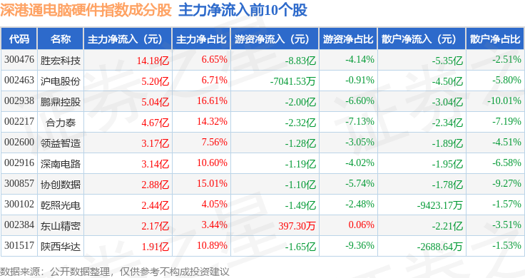 资金流向方面,深港通电脑硬件(983043)指数成份股当日主力资金净流入合计6.27亿元,游资资金净流出合计14.85亿元,散户资金净流入合计8.58亿元。成份股资金流向详情见下表: