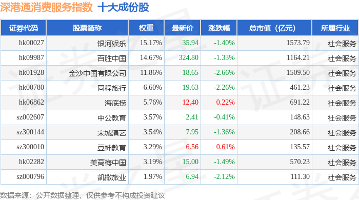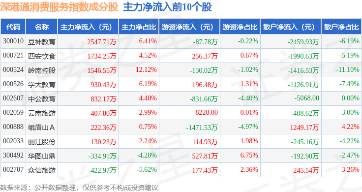 资金流向方面,深港通消费服务(983045)指数成份股当日主力资金净流出合计1.5亿元,游资资金净流出合计5697.31万元,散户资金净流入合计2.06亿元。成份股资金流向详情见下表: