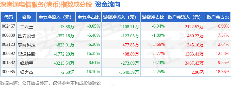 资金流向方面,深港通电信服务(港币)(983058)指数成份股当日主力资金净流出合计3.22亿元,游资资金净流出合计5259.31万元,散户资金净流入合计3.74亿元。成份股资金流向详情见下表: