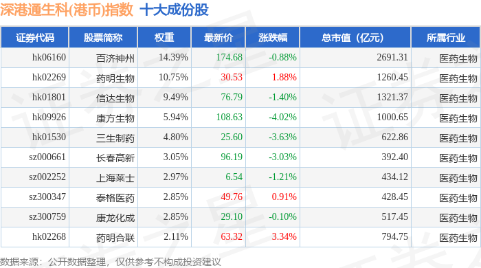 深港通生科(港币)(983060)指数十大成份股详情如下: