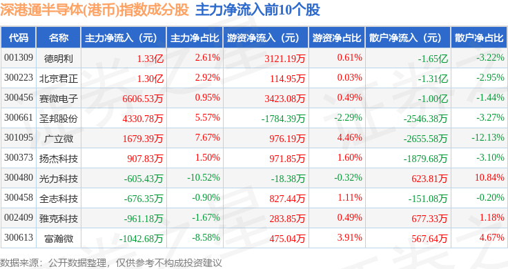 资金流向方面,深港通半导体(港币)(983068)指数成份股当日主力资金净流出合计4.49亿元,游资资金净流入合计2.53亿元,散户资金净流入合计1.97亿元。成份股资金流向详情见下表: