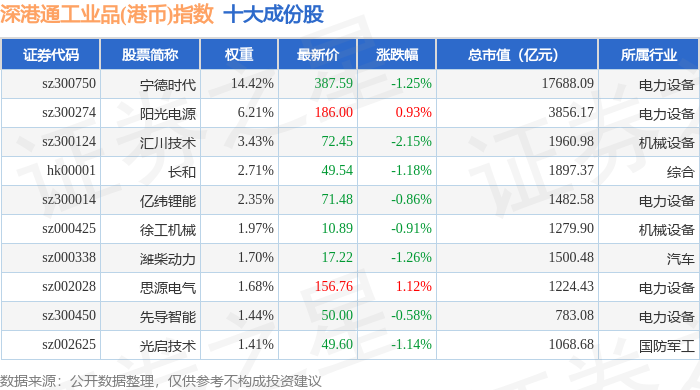 深港通工业品(港币)(983070)指数十大成份股详情如下: