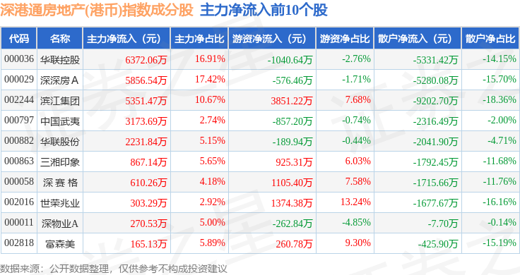 资金流向方面,深港通房地产(港币)(983072)指数成份股当日主力资金净流出合计4.03亿元,游资资金净流入合计2.5亿元,散户资金净流入合计1.52亿元。成份股资金流向详情见下表: