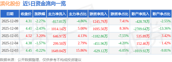 证券之星消息,截至2025年12月9日收盘,滨化股份(601678)报收于4.31元,下跌2.27%,换手率1.91%,成交量38.81万手,成交额1.68亿元。