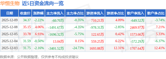 证券之星消息,截至2025年12月9日收盘,华恒生物(688639)报收于34.37元,下跌2.22%,换手率2.0%,成交量4.99万手,成交额1.74亿元。