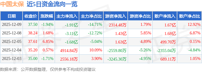 证券之星消息,截至2025年12月9日收盘,中国太保(601601)报收于37.5元,下跌1.94%,换手率0.5%,成交量34.29万手,成交额12.96亿元。