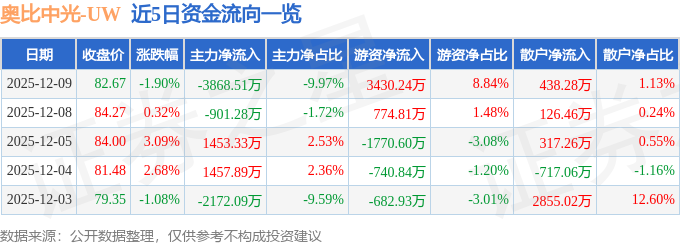 证券之星消息,截至2025年12月9日收盘,奥比中光(688322)报收于82.67元,下跌1.9%,换手率1.6%,成交量4.66万手,成交额3.88亿元。