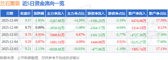 12月9日的资金流向数据方面,主力资金净流出5287.88万元,占总成交额14.2%,游资资金净流出1186.2万元,占总成交额3.19%,散户资金净流入6474.08万元,占总成交额17.39%。