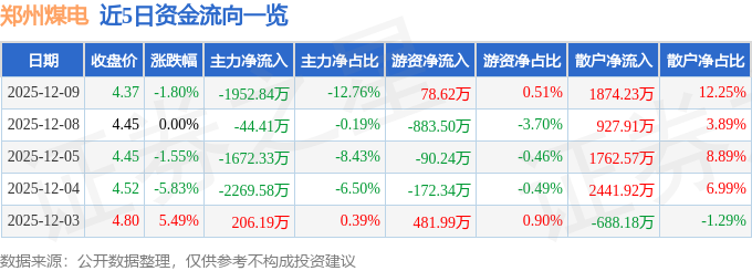 证券之星消息,截至2025年12月9日收盘,郑州煤电(600121)报收于4.37元,下跌1.8%,换手率2.86%,成交量34.89万手,成交额1.53亿元。