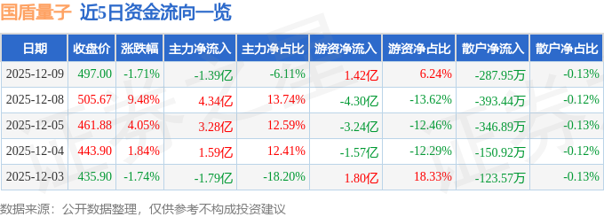 证券之星消息,截至2025年12月9日收盘,国盾量子(688027)报收于497.0元,下跌1.71%,换手率5.6%,成交量4.5万手,成交额22.7亿元。