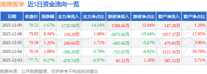 证券之星消息,截至2025年12月9日收盘,南微医学(688029)报收于78.52元,下跌1.67%,换手率0.83%,成交量1.56万手,成交额1.23亿元。