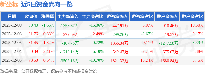 证券之星消息,截至2025年12月9日收盘,新坐标(603040)报收于80.4元,下跌1.66%,换手率0.81%,成交量1.09万手,成交额8841.18万元。