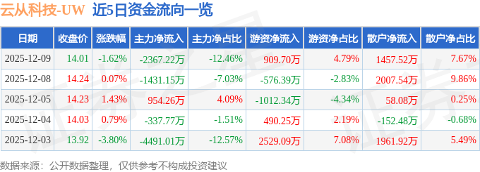 证券之星消息,截至2025年12月9日收盘,云从科技(688327)报收于14.01元,下跌1.62%,换手率1.61%,成交量13.42万手,成交额1.9亿元。