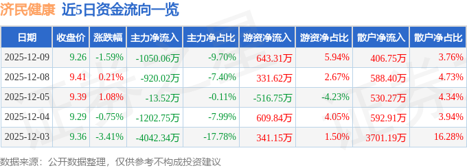 证券之星消息,截至2025年12月9日收盘,济民健康(603222)报收于9.26元,下跌1.59%,换手率2.21%,成交量11.62万手,成交额1.08亿元。