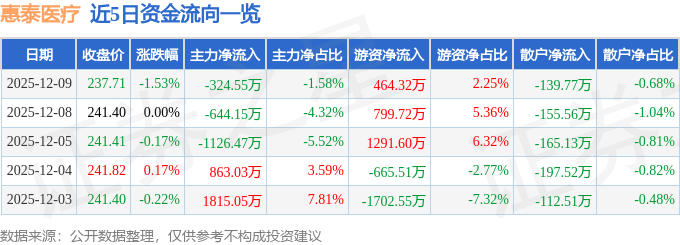 证券之星消息,截至2025年12月9日收盘,惠泰医疗(688617)报收于237.71元,下跌1.53%,换手率0.61%,成交量8633.0手,成交额2.06亿元。