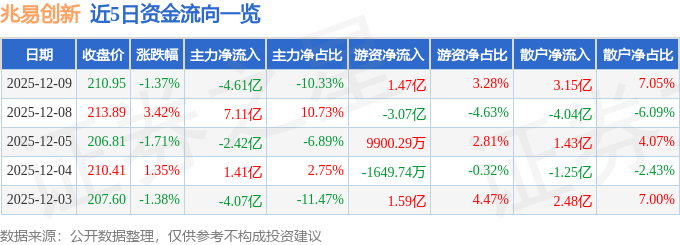 证券之星消息,截至2025年12月9日收盘,兆易创新(603986)报收于210.95元,下跌1.37%,换手率3.15%,成交量21.06万手,成交额44.64亿元。
