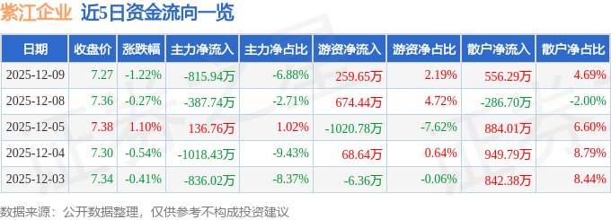 证券之星消息,截至2025年12月9日收盘,紫江企业(600210)报收于7.27元,下跌1.22%,换手率1.07%,成交量16.25万手,成交额1.19亿元。