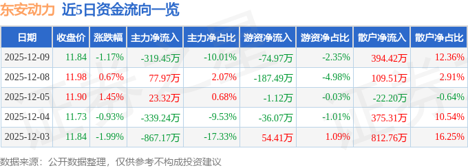 证券之星消息,截至2025年12月9日收盘,东安动力(600178)报收于11.84元,下跌1.17%,换手率0.57%,成交量2.68万手,成交额3191.63万元。