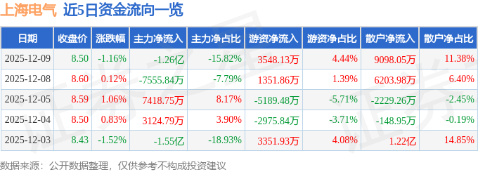 证券之星消息,截至2025年12月9日收盘,上海电气(601727)报收于8.5元,下跌1.16%,换手率0.74%,成交量93.67万手,成交额7.99亿元。