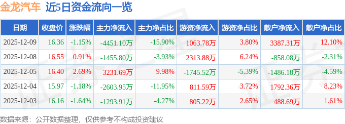 证券之星消息,截至2025年12月9日收盘,金龙汽车(600686)报收于16.36元,下跌1.15%,换手率2.38%,成交量17.03万手,成交额2.8亿元。