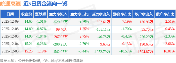 证券之星消息,截至2025年12月9日收盘,皖通高速(600012)报收于14.65元,下跌1.01%,换手率0.32%,成交量3.69万手,成交额5457.26万元。